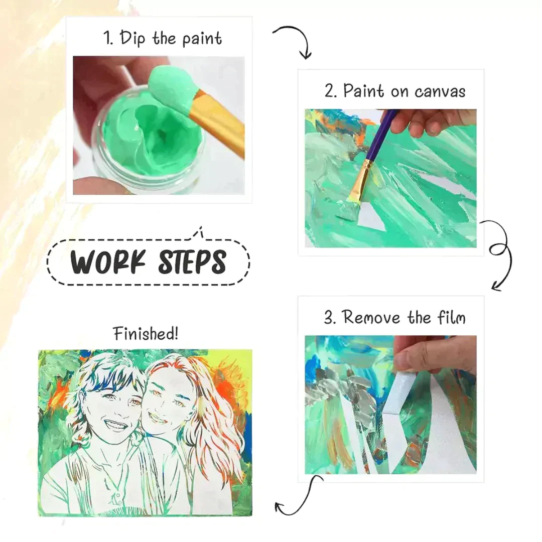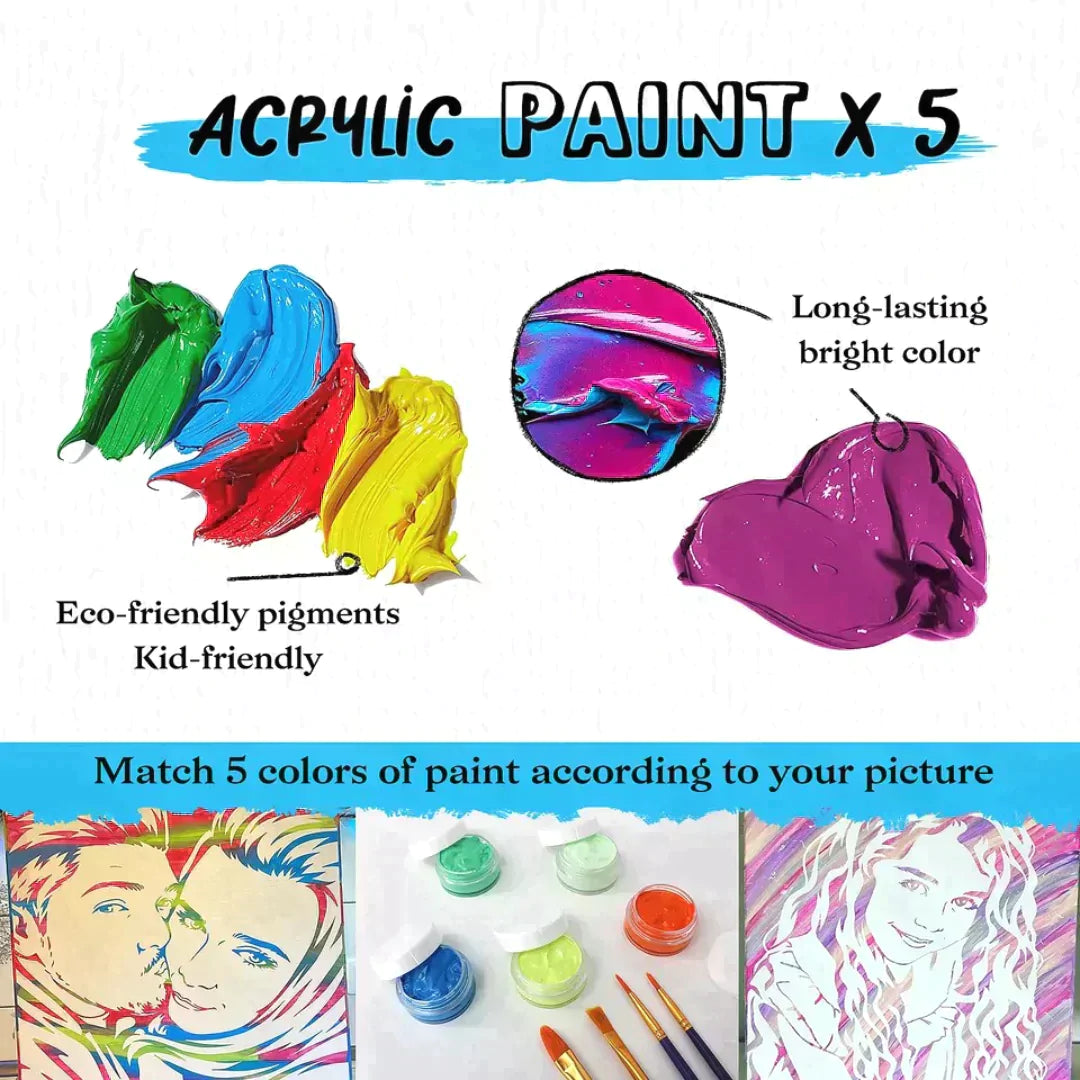 Each kit will be unique, and you get to choose the style you want to create with by using the 5 x Acrylic Colours. Mix and match to create the colour you desire. Once you have finished painting the canvas, all you need to do is remove the stickers to reveal your masterpiece.